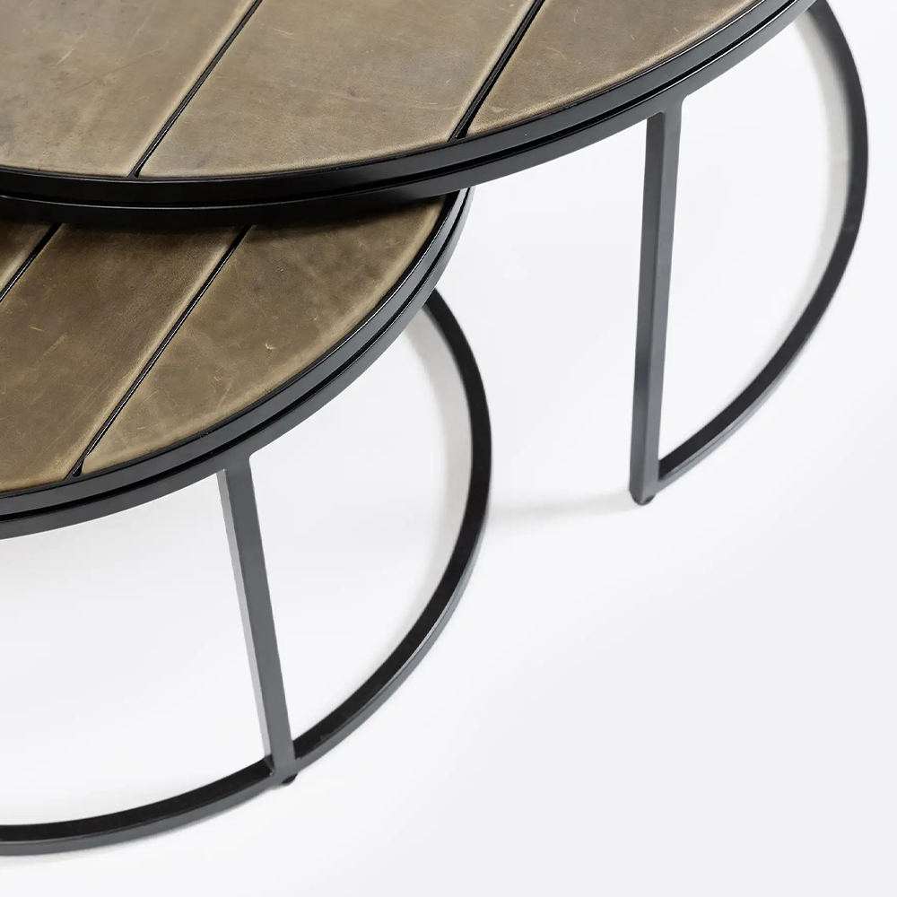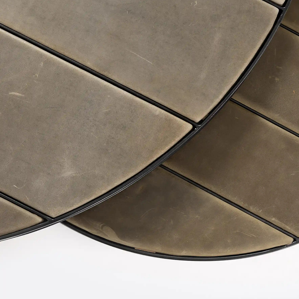 This pair of side tables is part of the RENGAR collection, which combines metal with natural cowhide in an original taupe colour. The difference in size between the two designs allows them to be nested to create different configurations. Industrial in style, they are very versatile and easy to carry thanks to their slim cylindrical iron structure. The leather of their innovative surface has been hand stretched over several parallel wooden planks, creating a distinctive and sophisticated pattern.