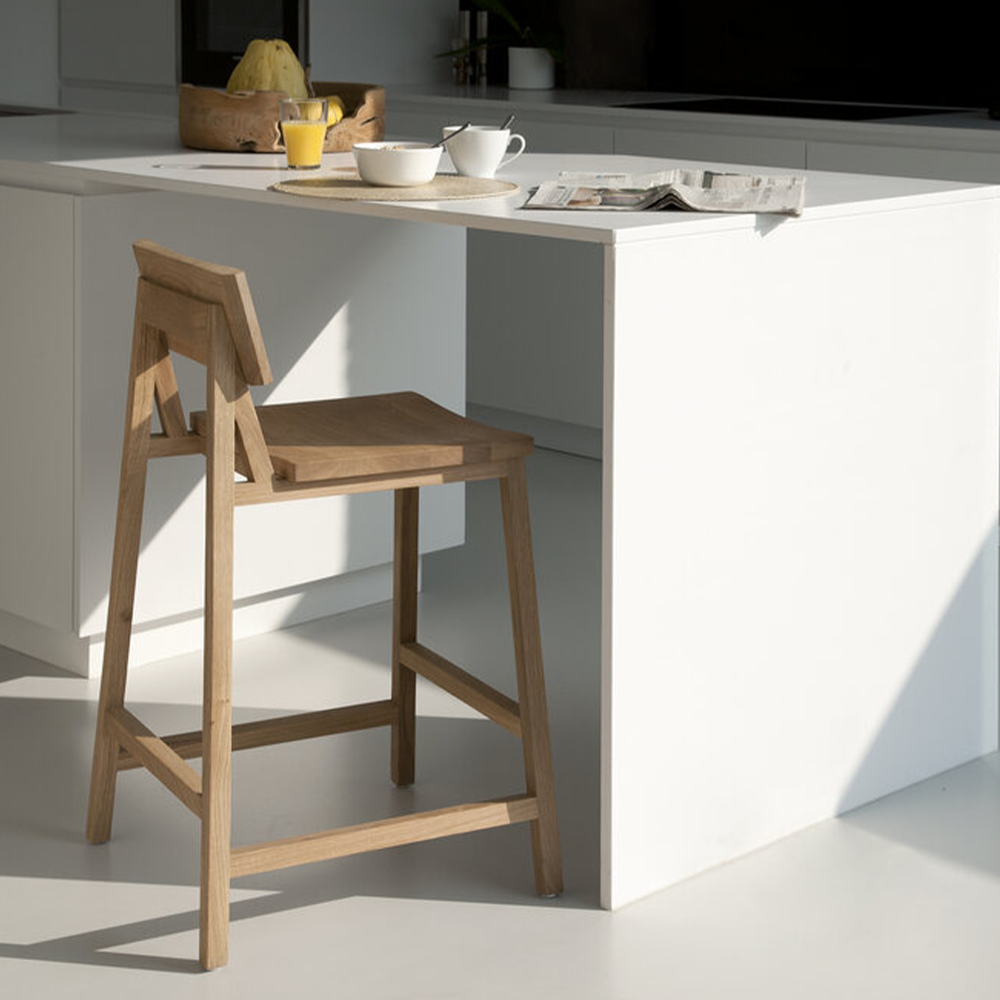Crafted from solid natural oak with a hard-wax oil finish, this counter stool fuses minimalist design with purposeful comfort. Its subtly angled seat and integrated footrest provide refined support, while the clean, straight lines enhance a modern aesthetic. Ideal for kitchen islands or high-top tables, this piece brings enduring warmth and architectural clarity to transitional or contemporary interiors.