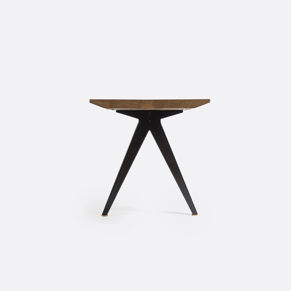 The idea behind the LIKU collection is to achieve an extremely strong structure with a surprisingly light appearance. This is made possible by the mitre-cutting technique, which allows the thickness of a solid board to be gradually reduced towards the edges, until it becomes an end that, when viewed from the side, gives the illusion of a slat. The combination of recycled teak with solid iron legs –or aluminium in the case of the chairs– provides remarkable stability and a sophisticated industrial look.