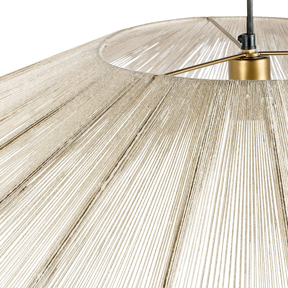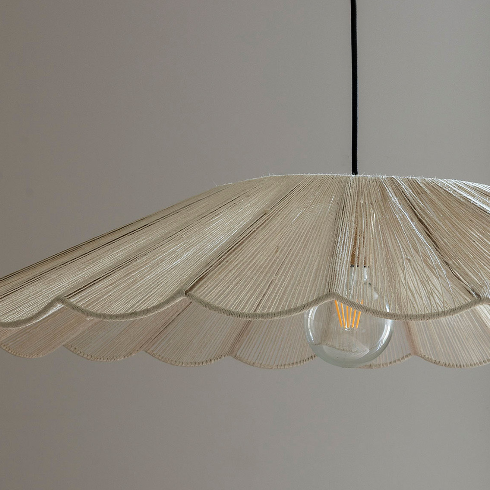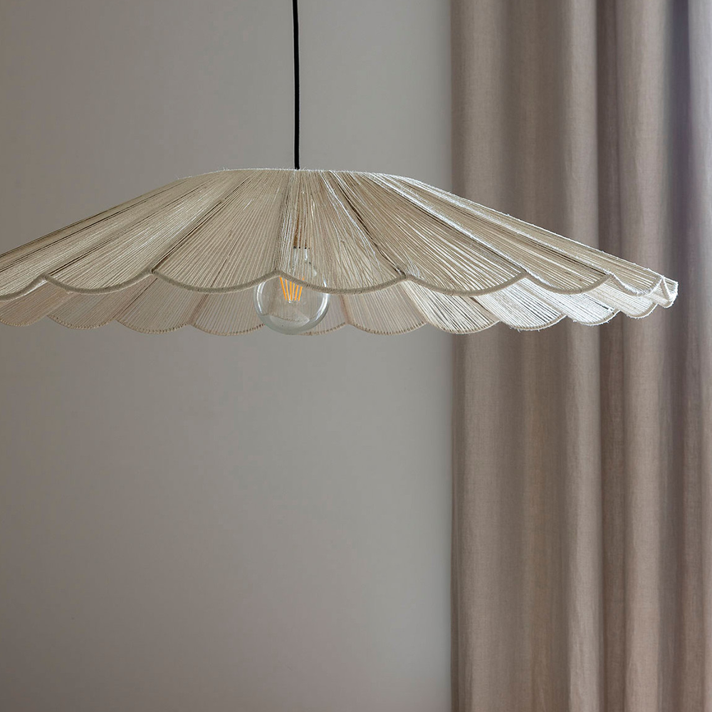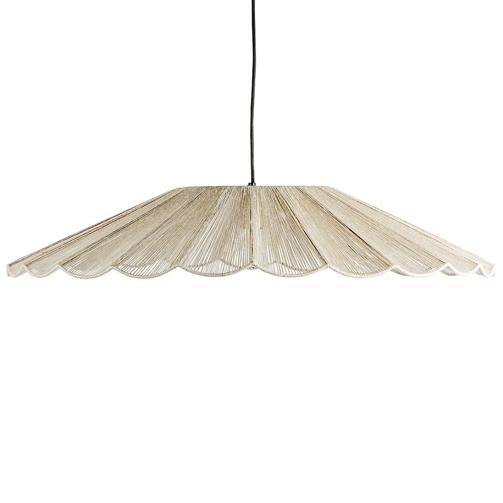 With its airy and natural design, this pendant light plays on the delicacy of white jute and the finesse of its metal structure. Its wide span creates a soft and diffuse halo, perfect for illuminating a living room or dining room with a subtle and soothing light.