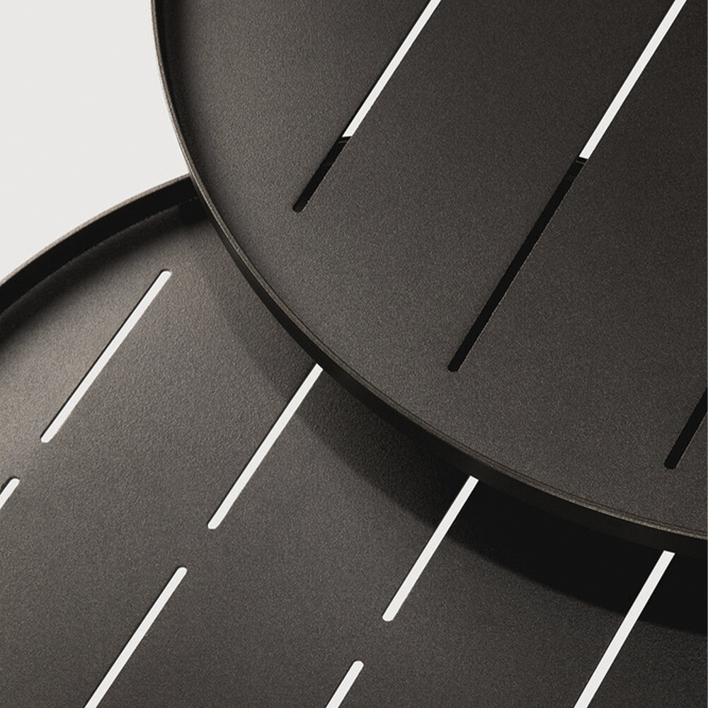Outdoor tray tables extend versatility into open-air settings. Serving as side or coffee tables, their tops are designed to accommodate our range of indoor or outdoor trays, allowing you to combine functionality with personal expression. Used individually or as a set, they provide adaptable surfaces that enhance outdoor lounging and dining areas.