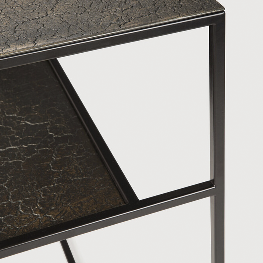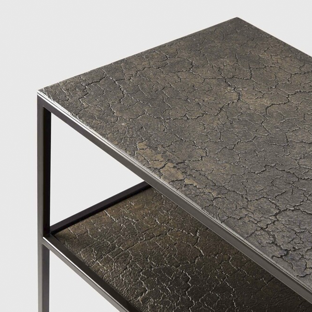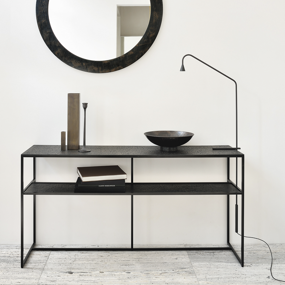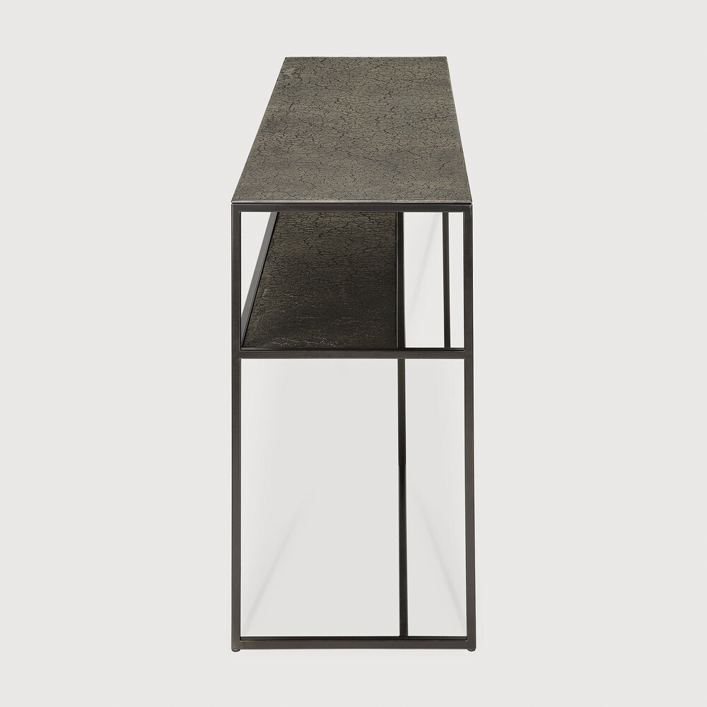 This console fuses minimalist elegance with distinctive formality, handcrafted from solid wood with a refined finish, its sculptural structure and angled design deliver a striking visual presence. The generous surface and subtle luxurious detailing make it a sophisticated piece that enriches modern interiors with warmth and sculptural attitude.