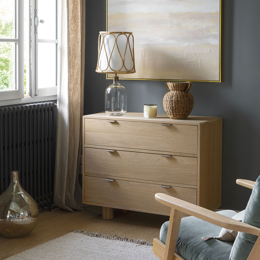 Our chest of drawers line fits naturally into all interior styles. You can combine the chest of drawers with other products from this line, such as the sideboard or the dining table. To perfect the decoration of your living room, place on the top souvenirs, a pretty vase, a plant, an abstract painting or a designer table lamp, ideal for highlighting the chest of drawers.