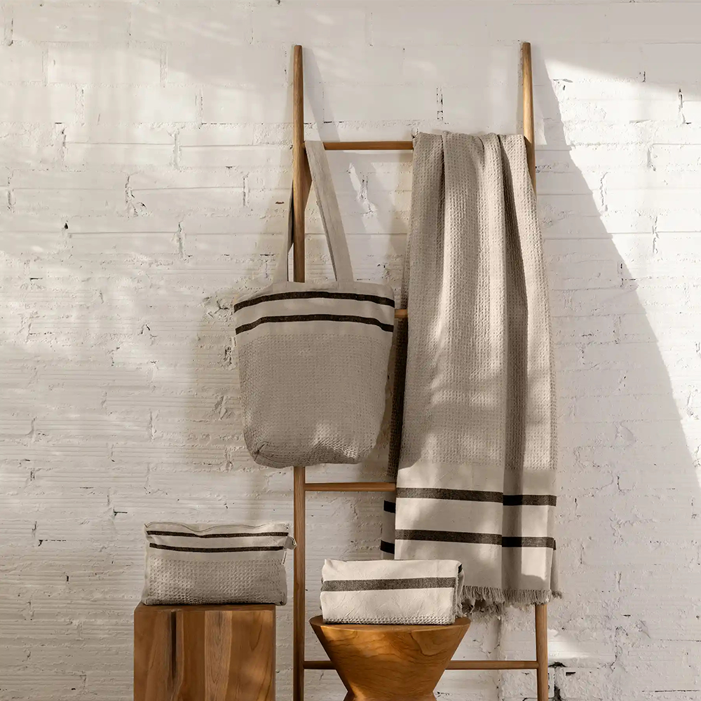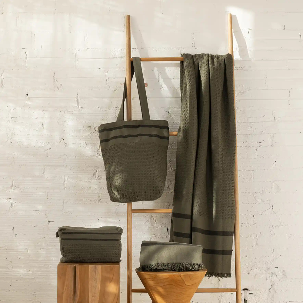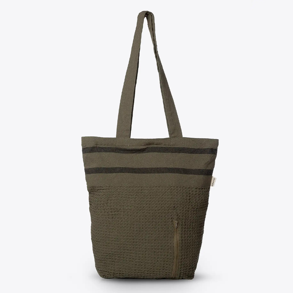 Tote bag with one large zip compartment and double long handle. Made from 100% recycled cotton with two horizontal black woven stripes. Available in three colours: white, biscuit and olive.