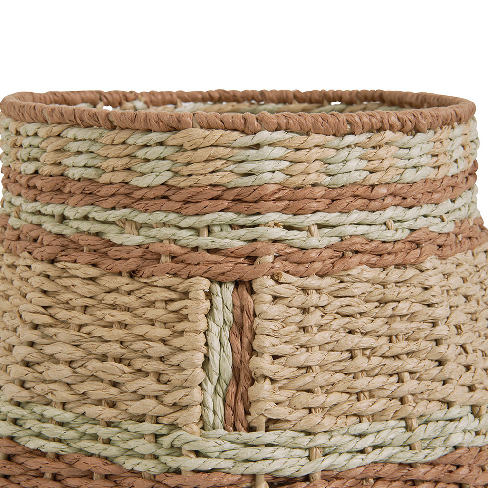 This vase seduces with its sculptural design and its artisanal texture, highlighting the braided paper rope in natural shades, bronze and sea green. Slender and refined, it elegantly dresses an interior, alone as a centerpiece or decorated with dried flowers.