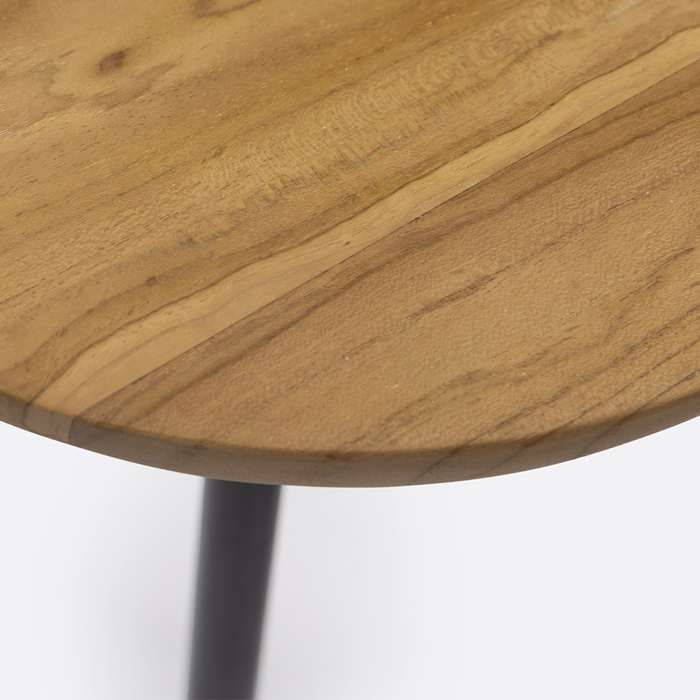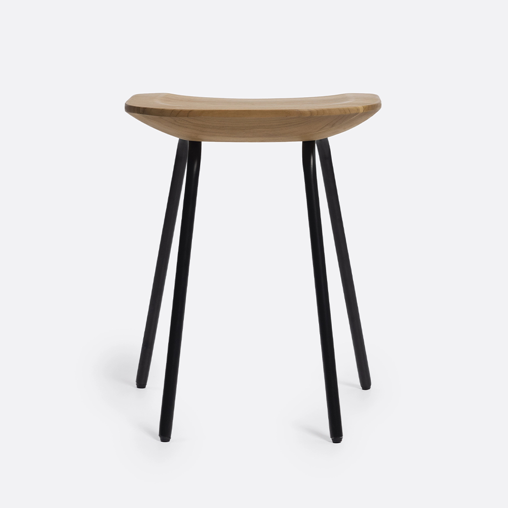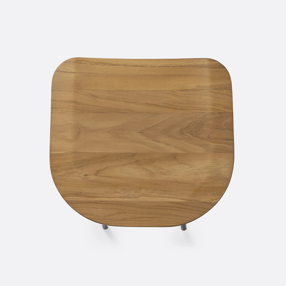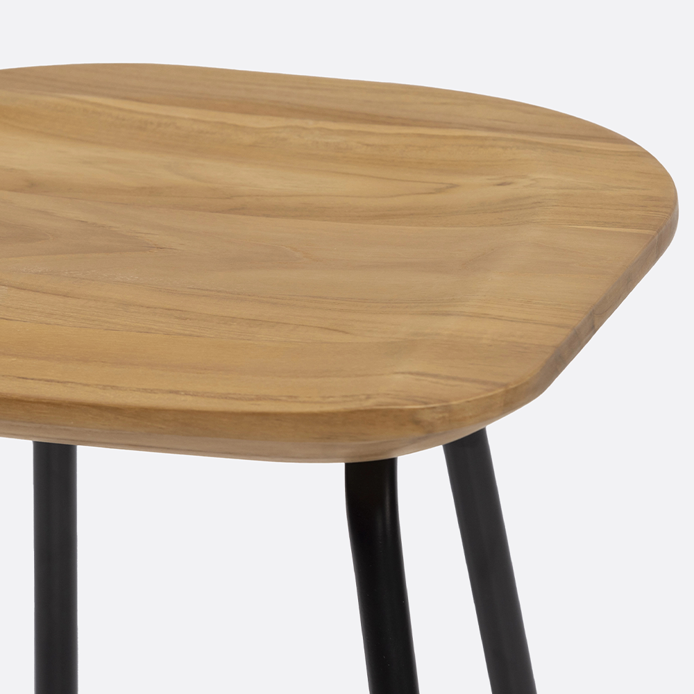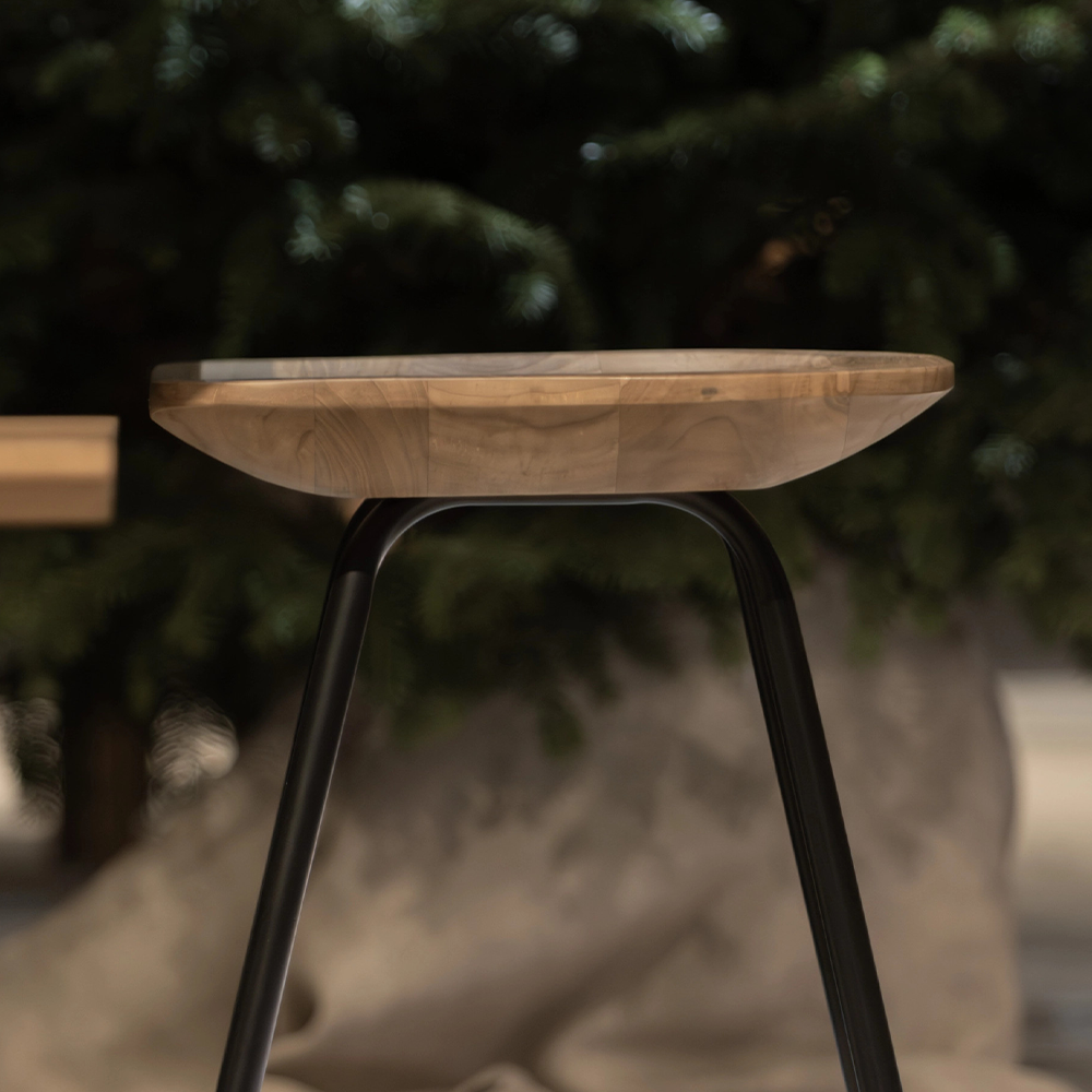 Crafted from Solid Teak Wood and sturdy iron combines functionality with a contemporary aesthetic. The stool’s carefully hand-carved seat has a solid, ergonomic finish that maximises comfort. The iron legs, with their minimalist and lightweight design, give the stool sturdy stability without compromising its light appearance. The contrast between the natural wood of the seat, with its unique grain, and the industrial black of the legs creates a harmonious visual balance, ideal for spaces that want a modern touch without losing the connection with craftsmanship.