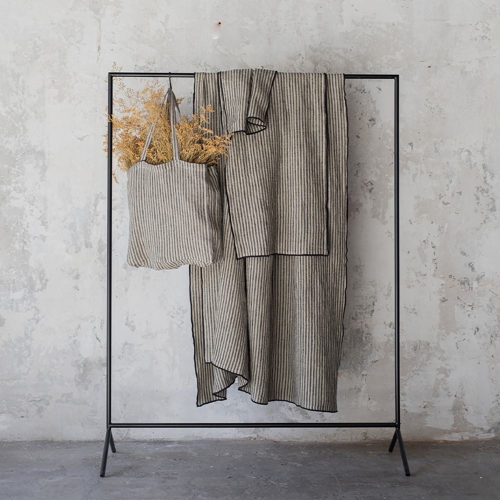 NOHAR tablecloth, handmade in 100% natural stonewashed linen with woven black stripes and black edging.