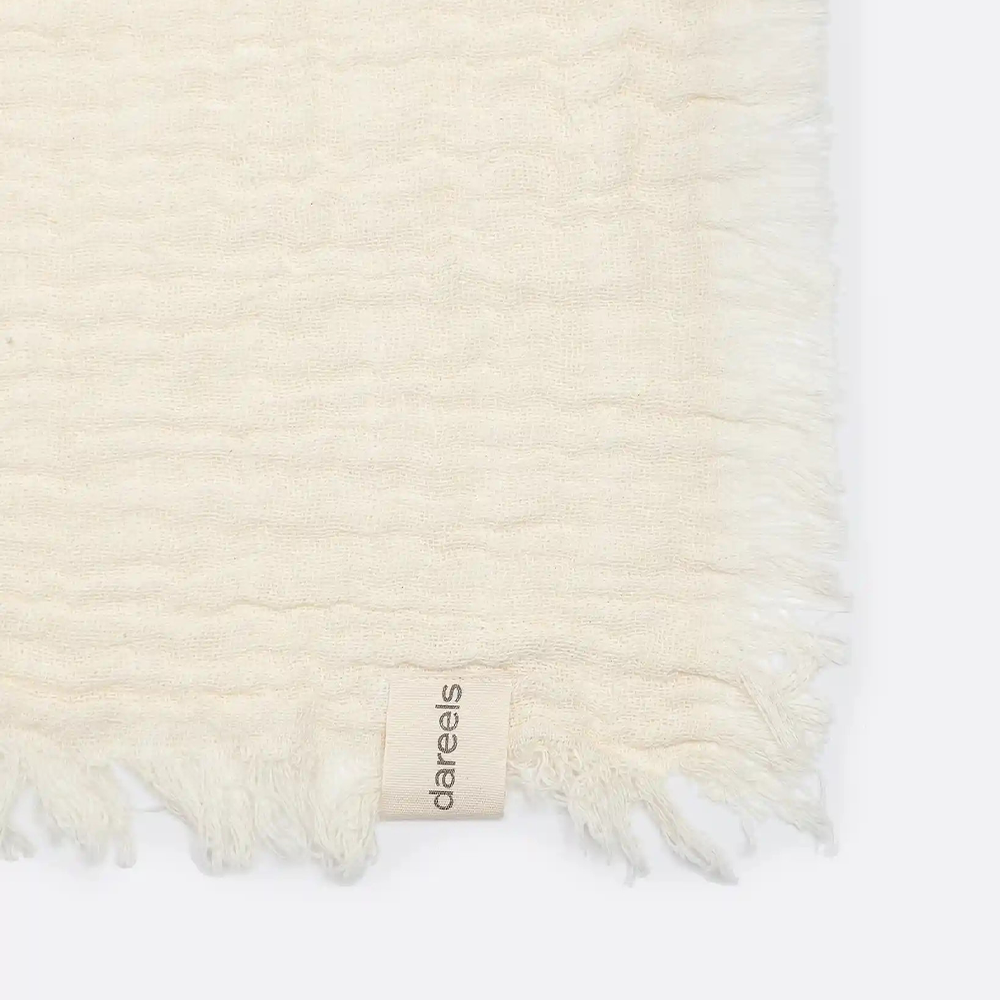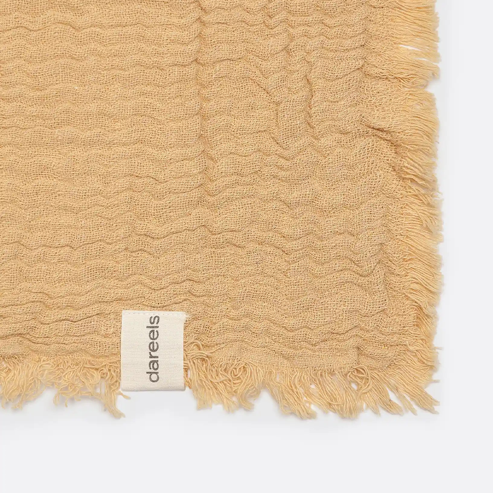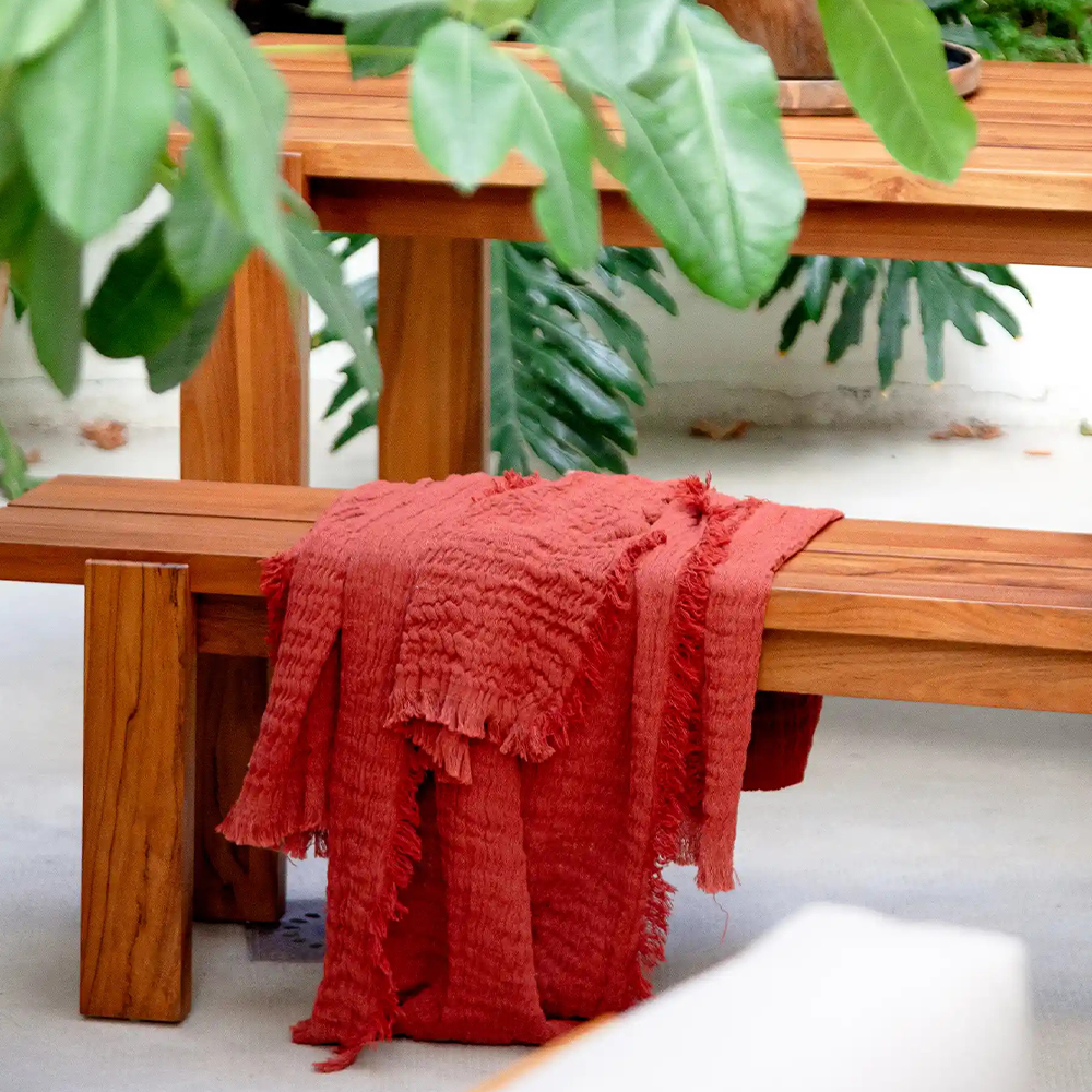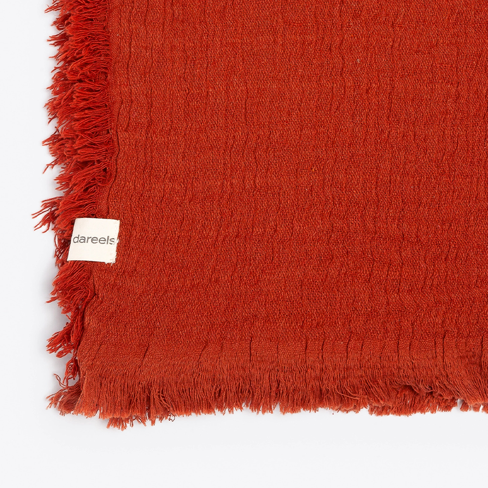 NADU double layer muslin towel. Handmade from 100% stonewashed recycled cotton. Terracotta design finished with short fringes.
