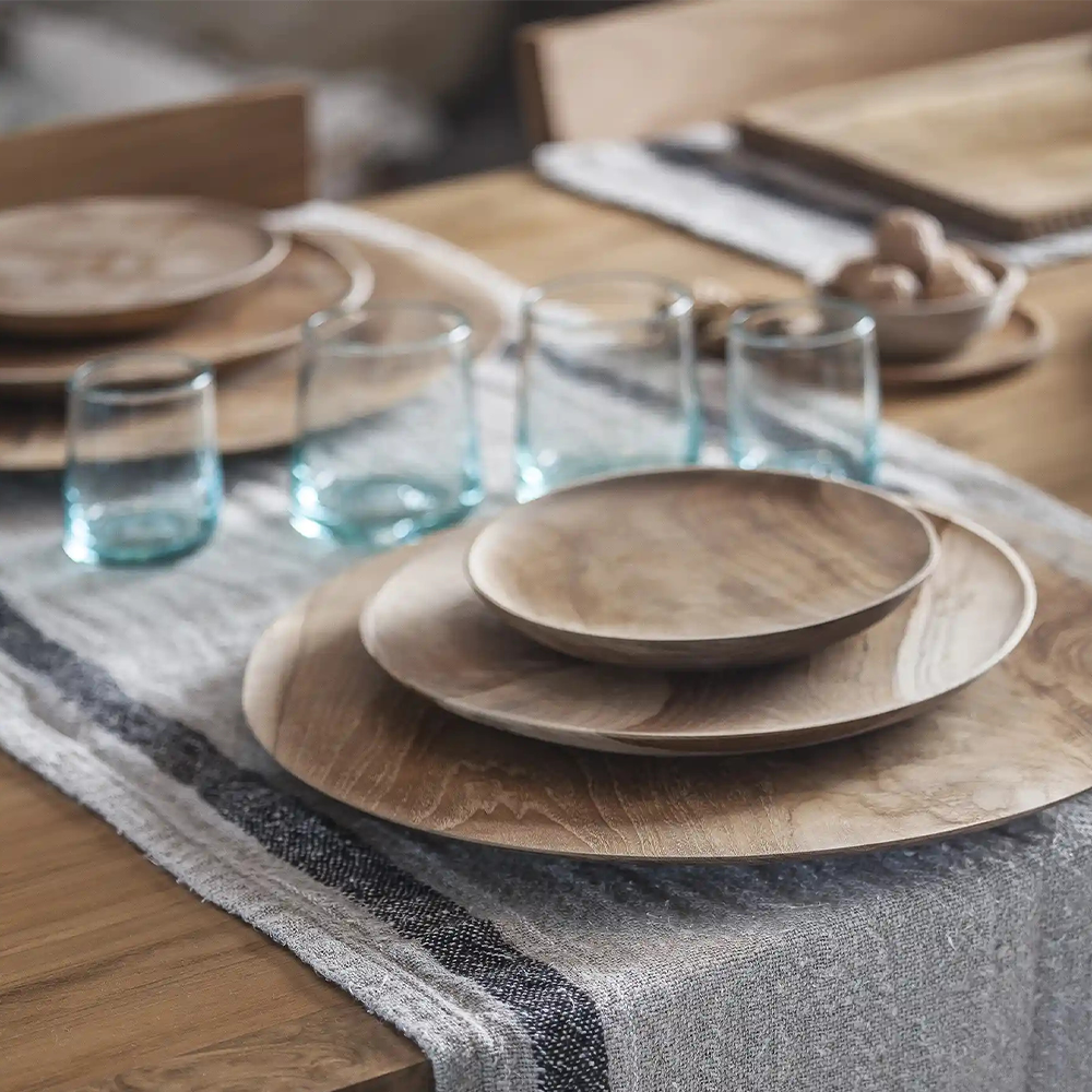 Made from teak root, this plate is a meticulously handcrafted piece. It features a round shape and a smooth finish in a natural tone. This simple and sturdy tableware item offers an elegant way to serve at the table with a touch of naturalness. Available in two different sizes, which blend harmoniously with each other.