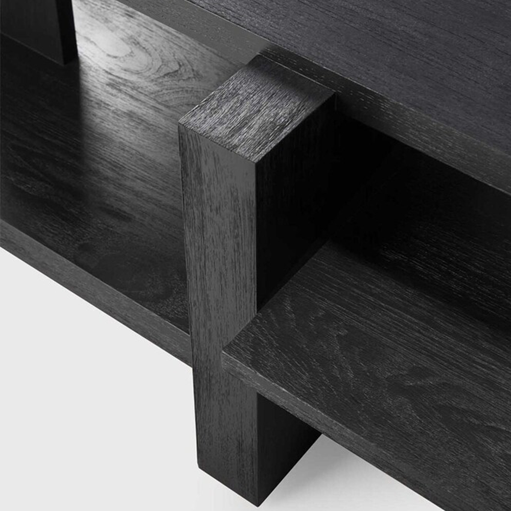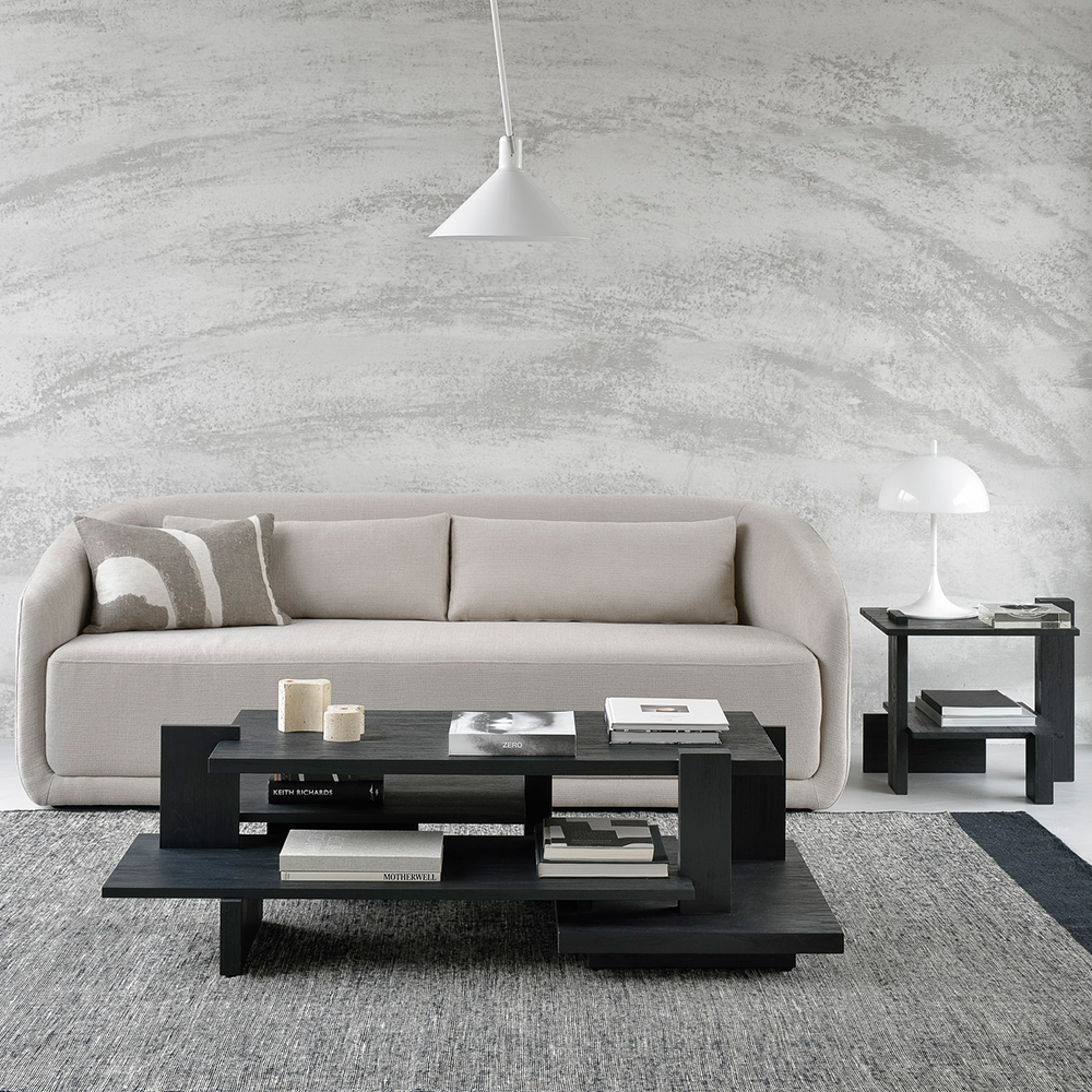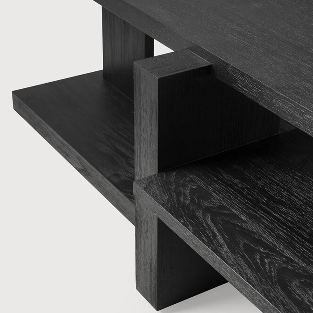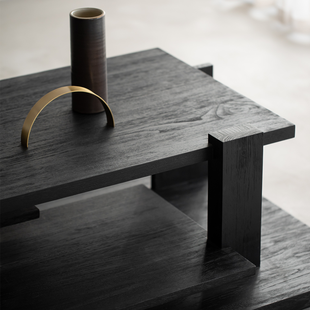 Inspired by the Dutch architectural movement, this tainted coffee table embodies both purposeful design and striking style. Its contemporary black finish accentuates bold proportions, revealing dynamic perspectives from every angle.