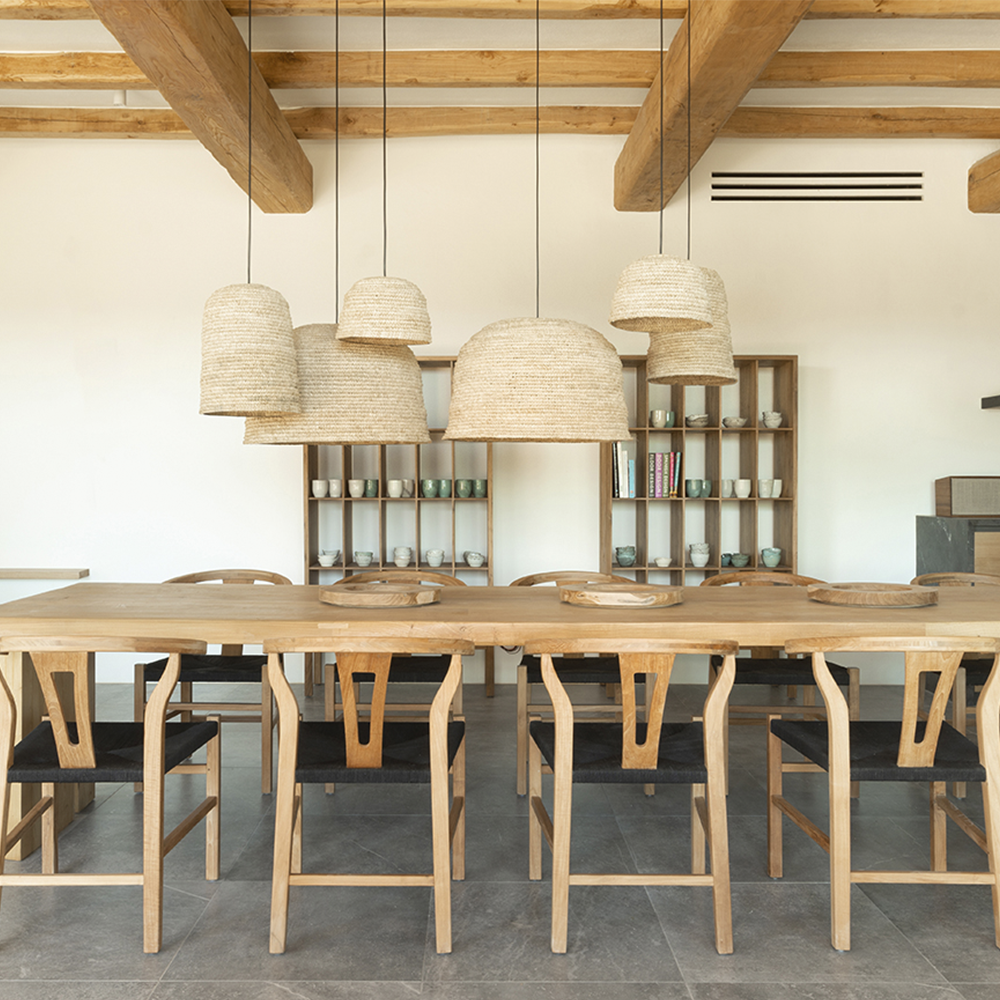 GOLF is a family of ceiling and table lamps characterised by the hand-woven natural fibres of seagrass. This pendant luminaire is reinforced by a continuous iron structure on the inside, protected by thermosetting powder paint, which supports and shapes the lampshade. Designed by Lagranja x Dareels, this model is available in a variety of sizes to create subtle and personalised lighting ensembles.