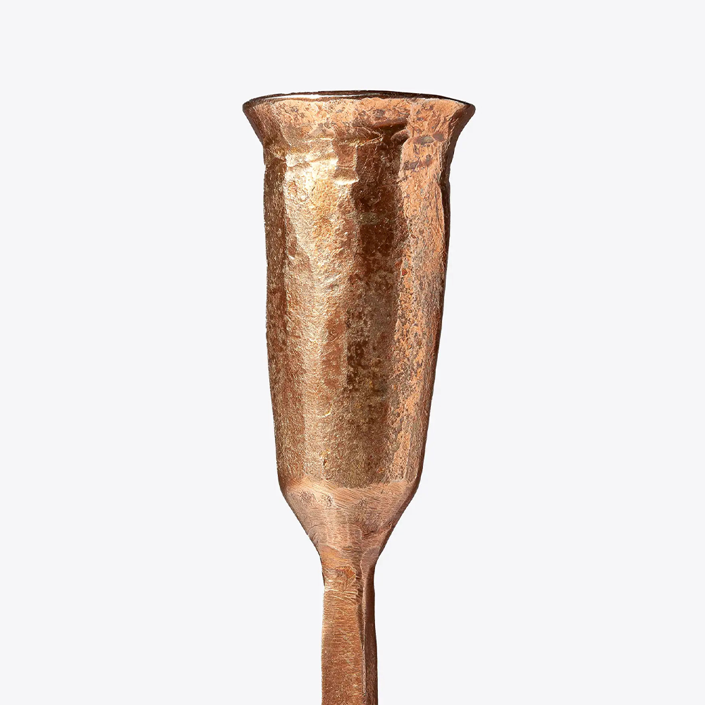 Handmade copper coloured iron candle holder. Each handcrafted piece is unique and slightly different from the others, adding style and exclusivity to any home. Suitable for standard 2 cm diameter candles. Available in four different styles and sizes.