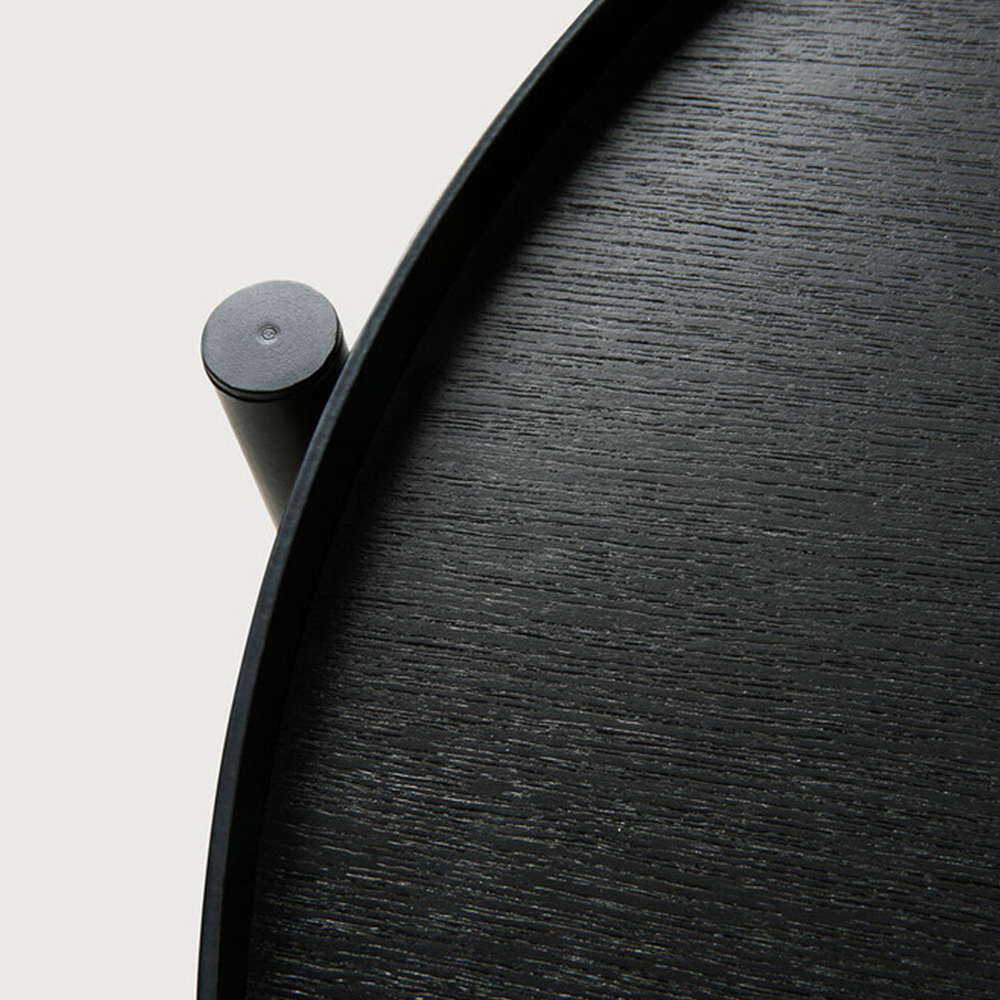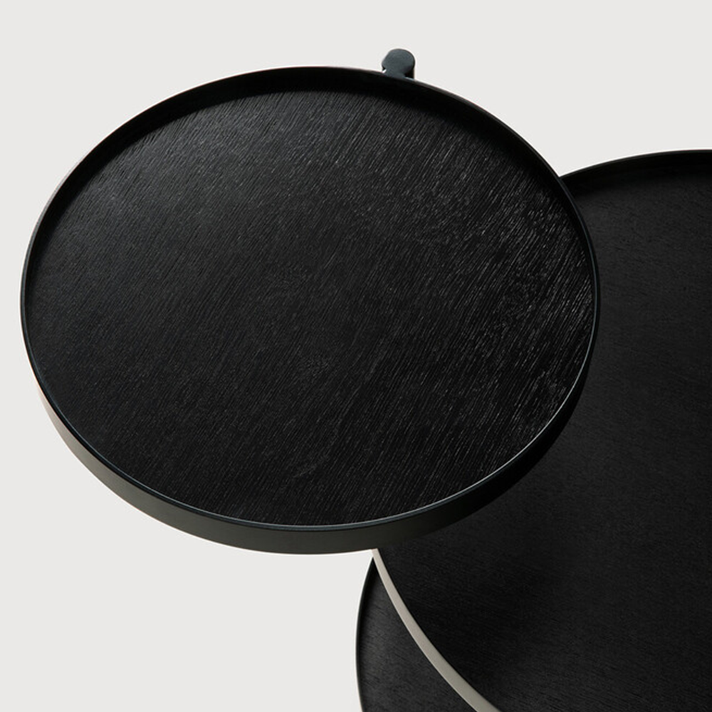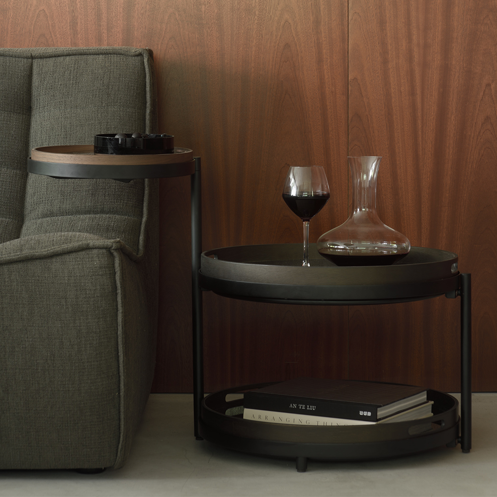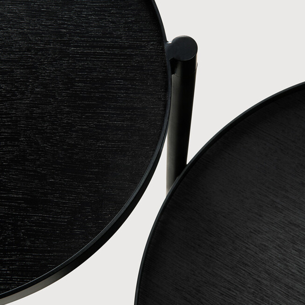 This sculptural side table features a refined design, combining a black-tainted wood with a water-based varnish finish and a black metal frame. Its elegant geometry and premium materials make it a sophisticated addition to modern interiors, offering both functionality and aesthetic appeal.