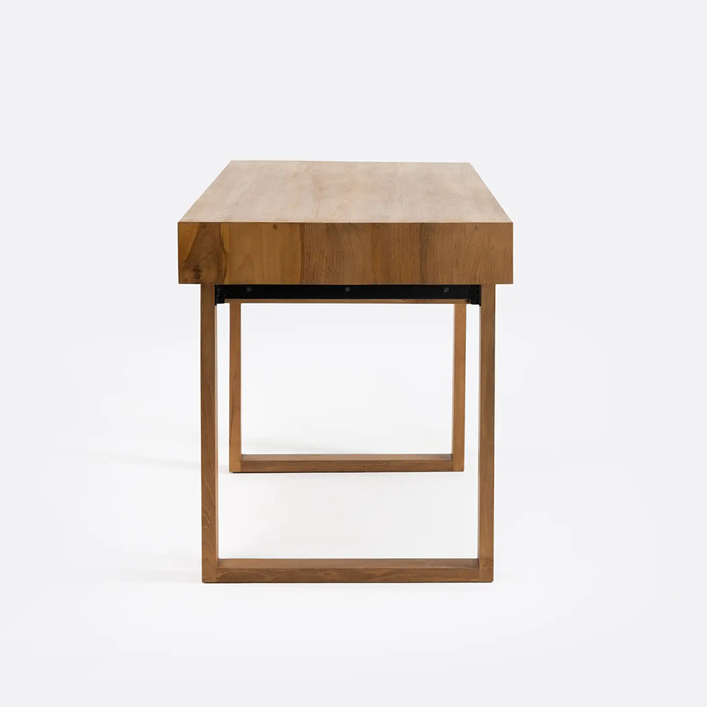 Geometrically Styled Solid Natural Teak Wood Desk with Four Drawers
