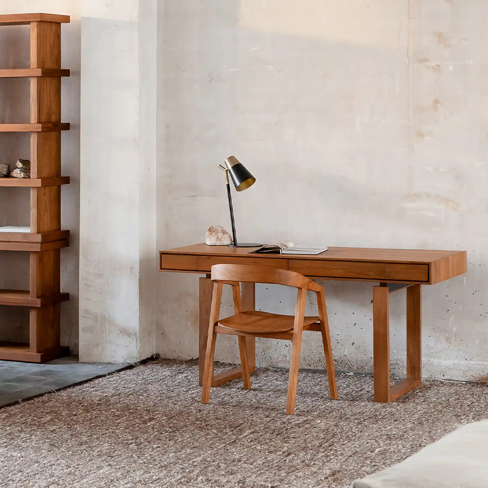The SINJAI desk is the result of a conscious exercise in geometry and symmetry. Made from recycled teak, it is characterised by its legs in the form of a solid square frame. Above it, an elegant, slender box seems to float, acting as a top and housing four practical drawers of two symmetrically arranged widths. The detail of the front edge, lowered to just one centimetre, creates a space around the drawers, giving the design an even greater sense of lightness and sophistication.