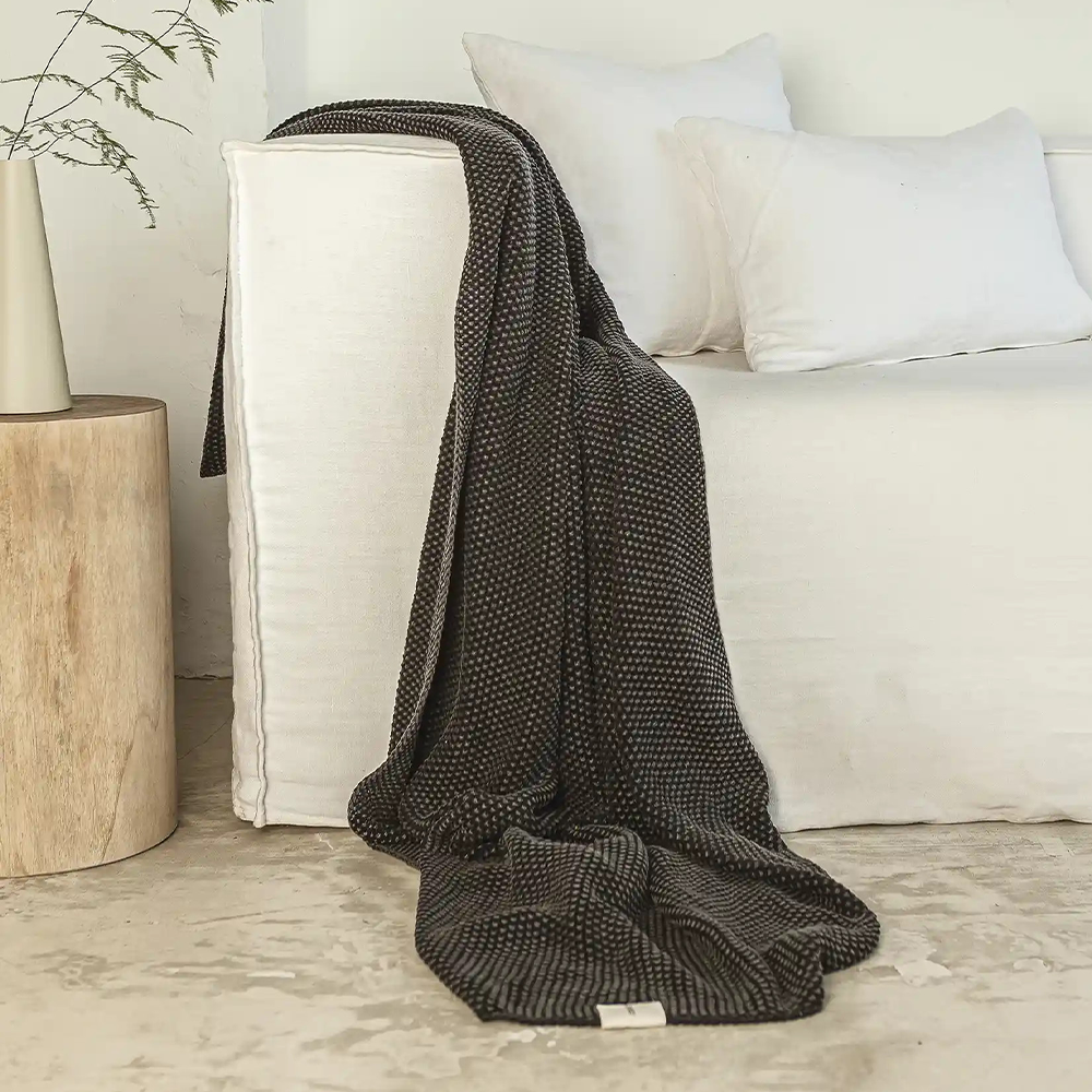 This throw is hand-woven in India from 100% organic cotton, offering an elegant and tasteful texture that elevates any space.This throw is hand-woven in India from 100% organic cotton, offering an elegant and tasteful texture that elevates any space. Its terracotta and black hue adds warmth and depth, while the artisanal weave ensures both softness and visual interest. Perfect for draping over sofas, beds, or chairs, it delivers comfort and character with a sustainably crafted touch.
