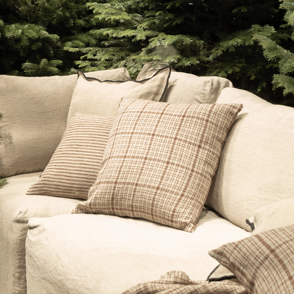 This cushion cover in natural linen features elegant brown and white stripe detailing, bringing a touch of timeless style to your decor. Designed for versatility and refined appeal, it transforms any cushion with a casual yet polished look. Ideal for living rooms, bedrooms, or cozy corners where you want a subtle pattern and sophisticated texture.