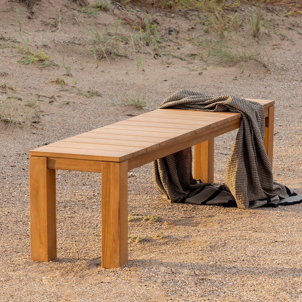 This outdoor bench features a minimalist design that highlights the natural beauty of teak wood. Its solid construction and precise assembly provide durability and a timeless aesthetic. Perfect for enhancing patios, terraces, or garden areas with an elegant and sustainable seating solution.This outdoor bench features a minimalist design that highlights the natural beauty of teak wood. Its solid construction and precise assembly provide durability and a timeless aesthetic. Perfect for enhancing patios, terraces, or garden areas with an elegant and sustainable seating solution.