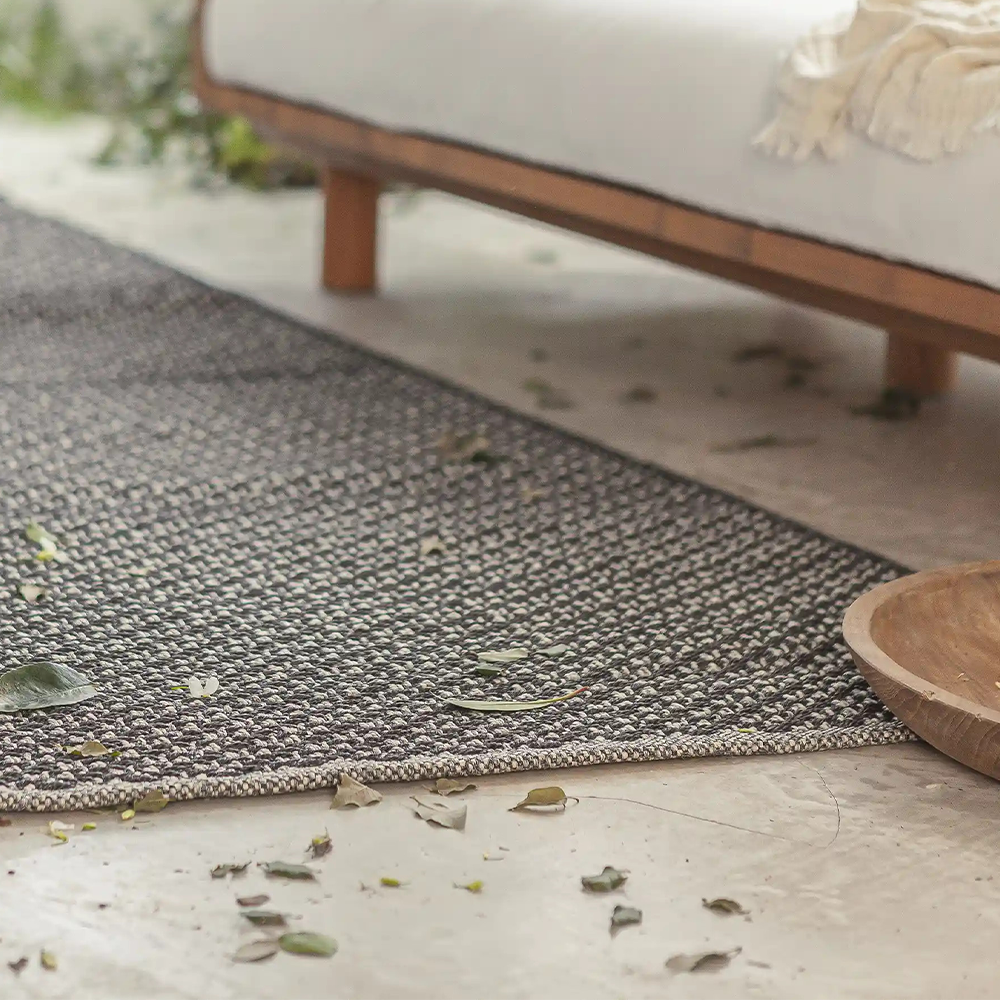 Hand-woven in 100% polypropylene, an easy care synthetic fibre with excellent resistance to wear and tear, water, mould and sunlight. Plain black design with white stitches. Suitable for both indoor and outdoor use.