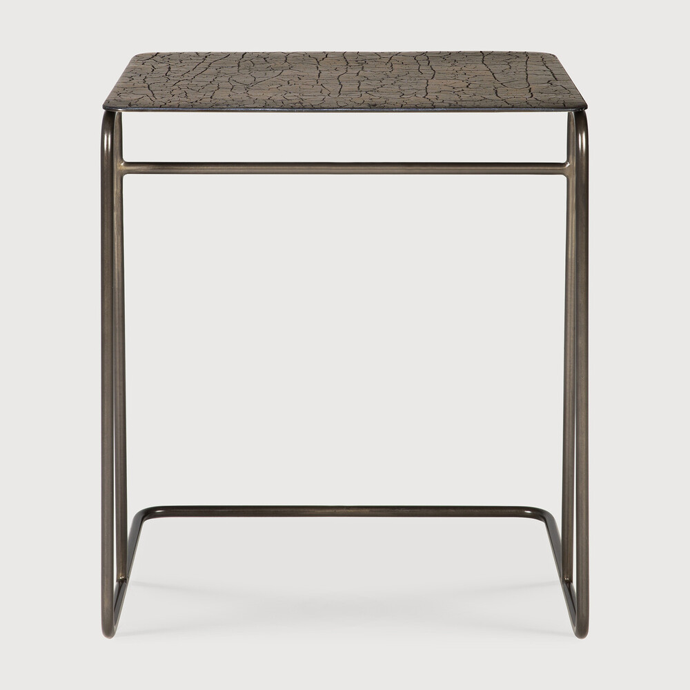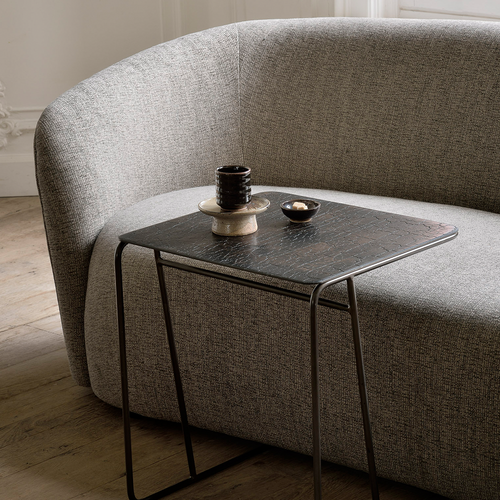 This side table showcases a sculptural design with smooth, flowing curves and an symmetrical organic form. The tabletop is meticulously handcrafted from a blend of mineral powders, natural pigments, and metallic elements, creating a subtle textured luxurious surface. Its refined shape and premium materials make it a sophisticated addition to contemporary interiors, seamlessly combining style, elegance, and functionality.