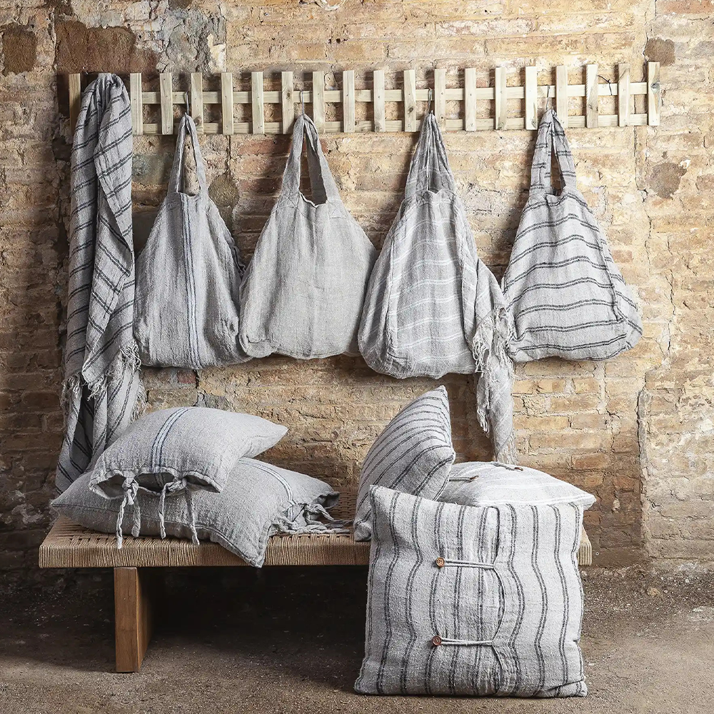 KURUVA cushion cover, handmade in Calcutta from 100% natural linen sourced from sustainable European flax plantations. Woven design with a double black stripe and fastened with two wooden buttons.