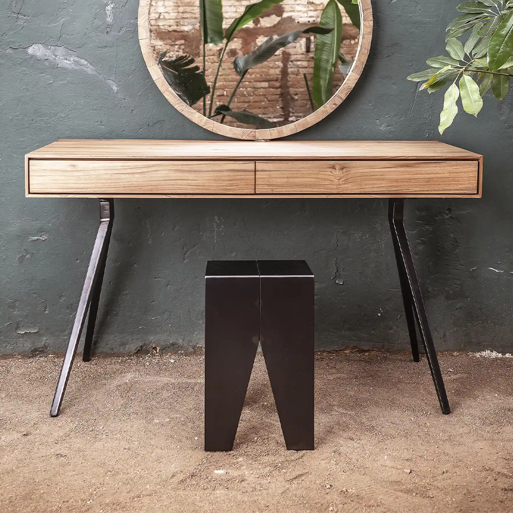 Solid Natural or Black Teak Wood Desk with Contemporary Black Iron Base