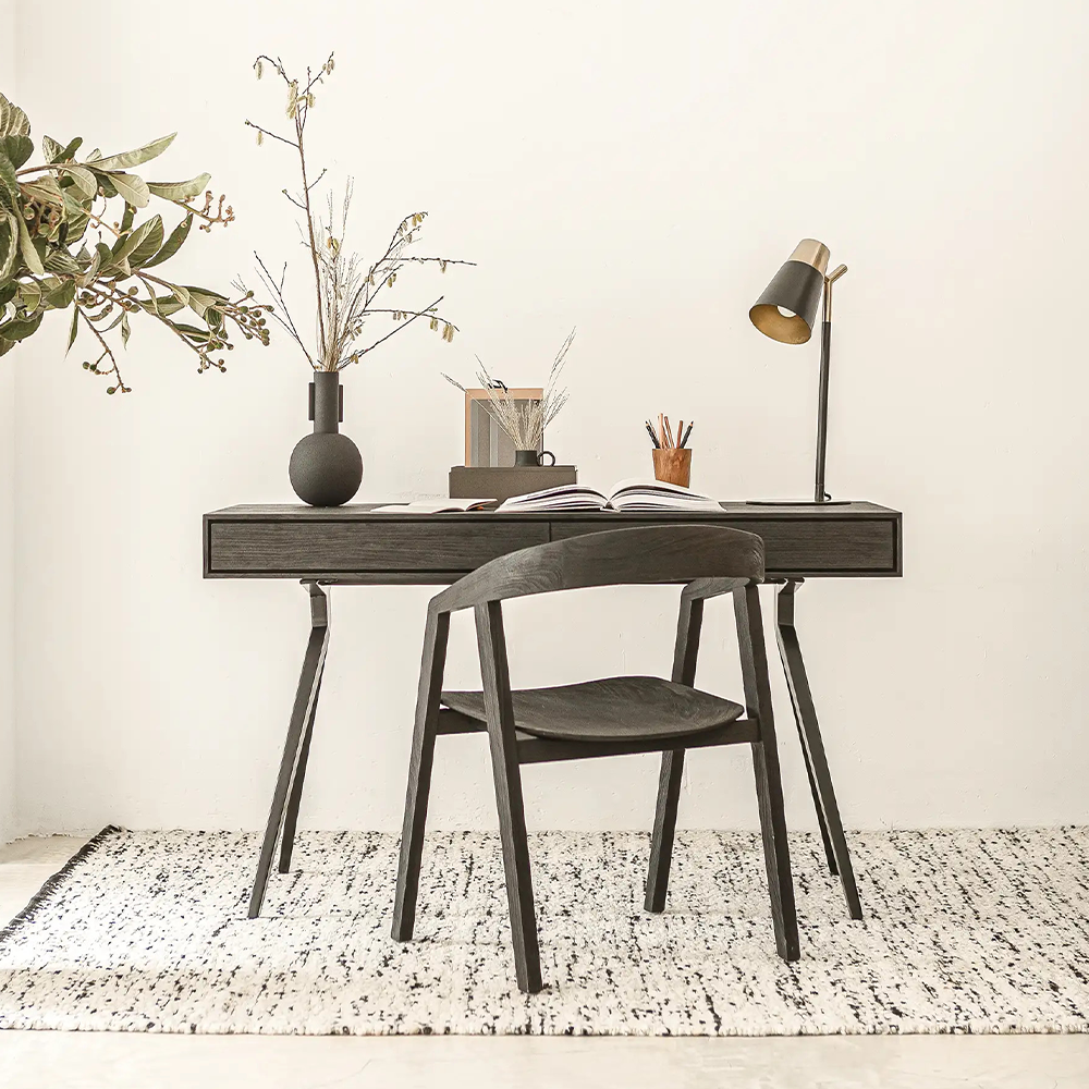 Work in style on this beautiful solid reclaimed Blackened Teak Wood Desk. Featuring two drawers and contemporary style black iron legs. This hand crafted desk features a rustic style wood finish.