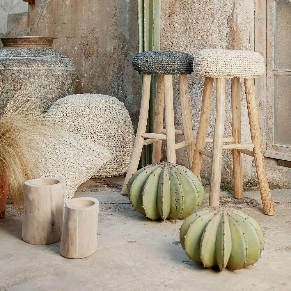 The Alga stool takes its name from the natural fibre that makes up its seat. It is sustainably grown seagrass, highly resistant, comfortable and 100% biodegradable. The remarkable thickness of its four sustainably sourced teak legs, together with the meticulous handcrafted assembly, make the use of crossbars superfluous to achieve perfect stability and solidity. A design that combines nature, tradition and functionality in a perfect synthesis of our principles. Available in two heights and two seat finishes: natural and black.