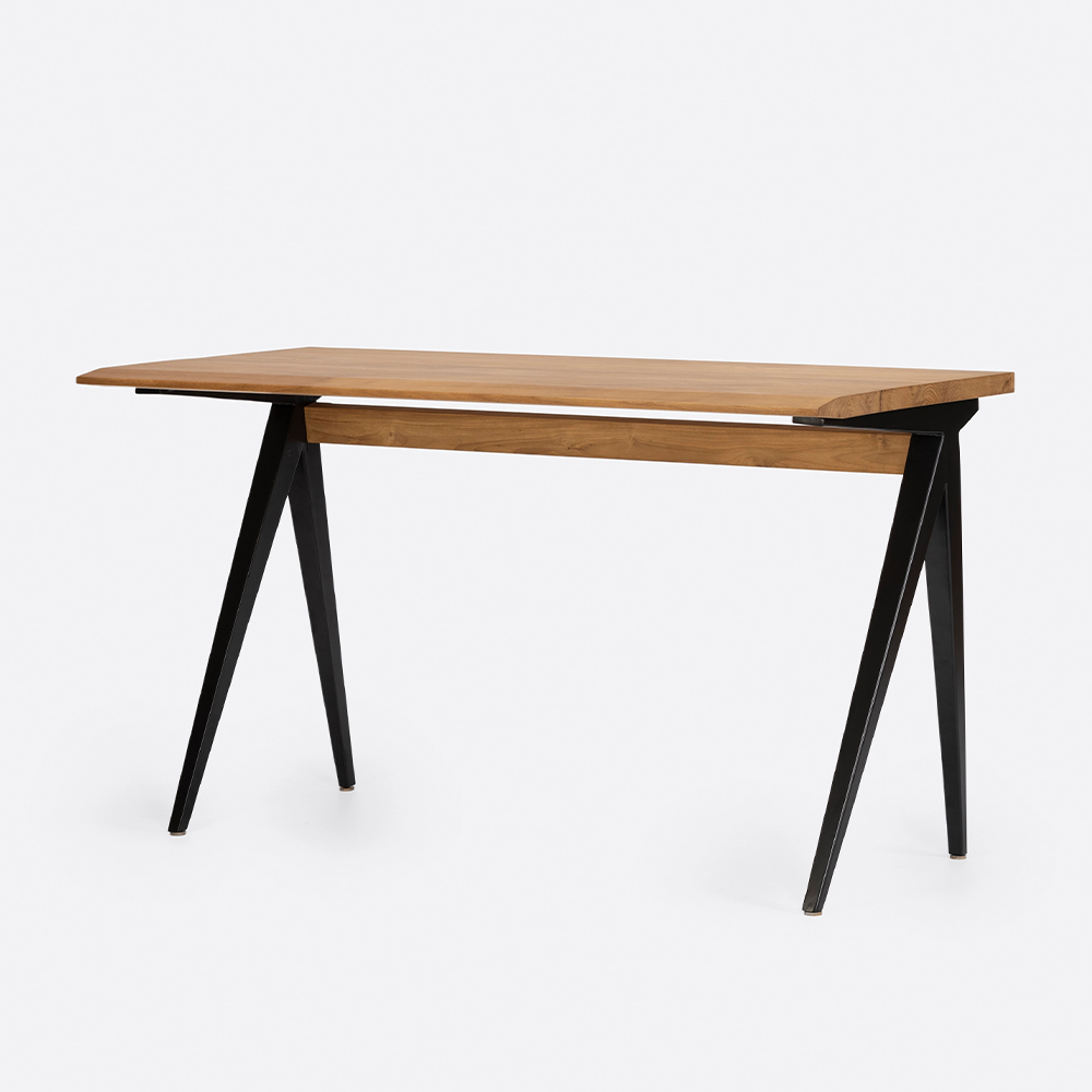Solid Natural Teak Wood Desk with Black Iron Contemporary Base