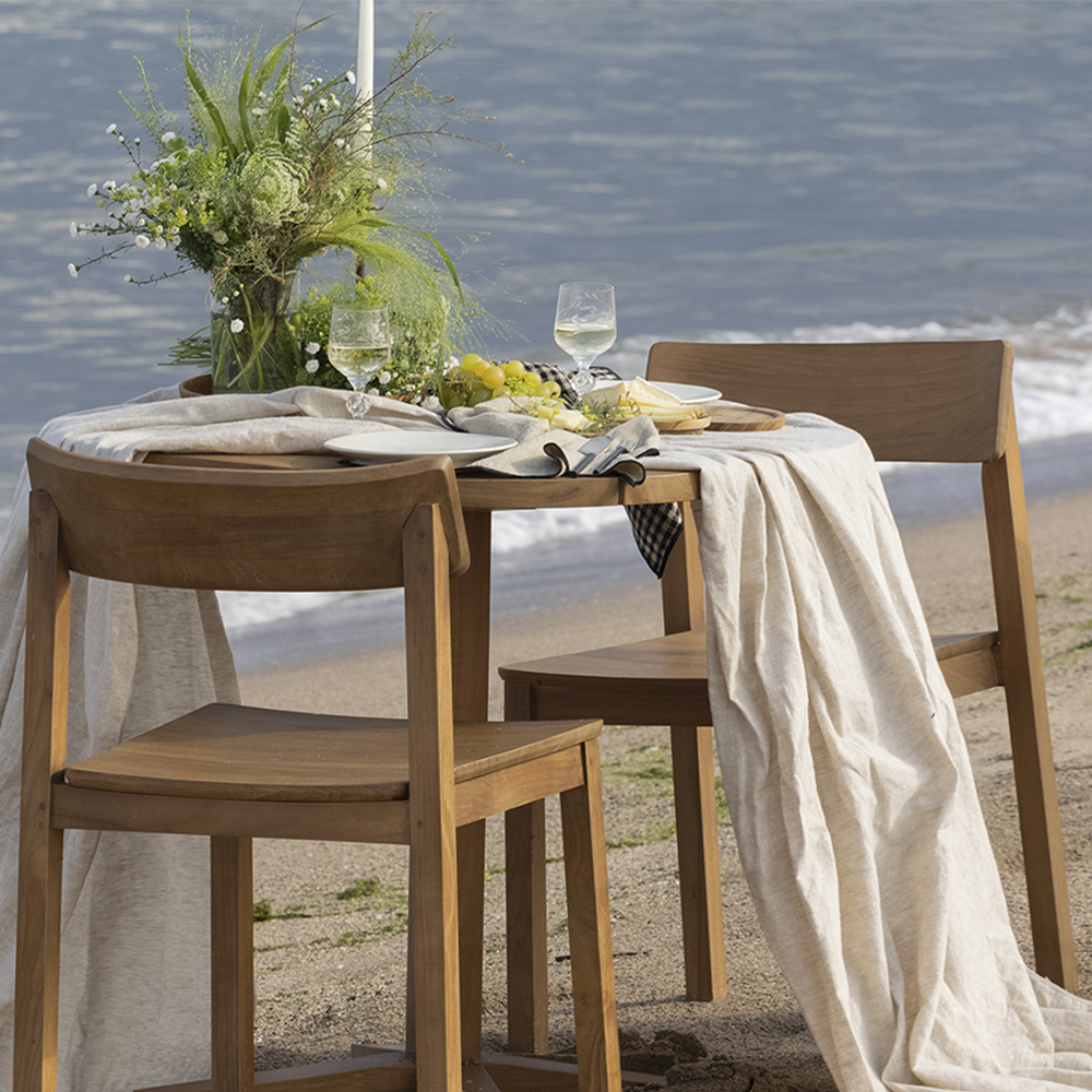 The RAWI WA chair collection is designed to be stackable and to meet the needs of contract projects, without neglecting its place in our general catalogue. Made entirely of teak, it features a subtly sloping and curved backrest which, together with the generous width of the seat, guarantees exceptional comfort. RAWI WA represents a timeless and refined aesthetic, with simple and straight lines, testimony to the dareels aesthetic, always marked by a return to the origins, where each piece of furniture is the result of a perfect balance between nature and manual creation.