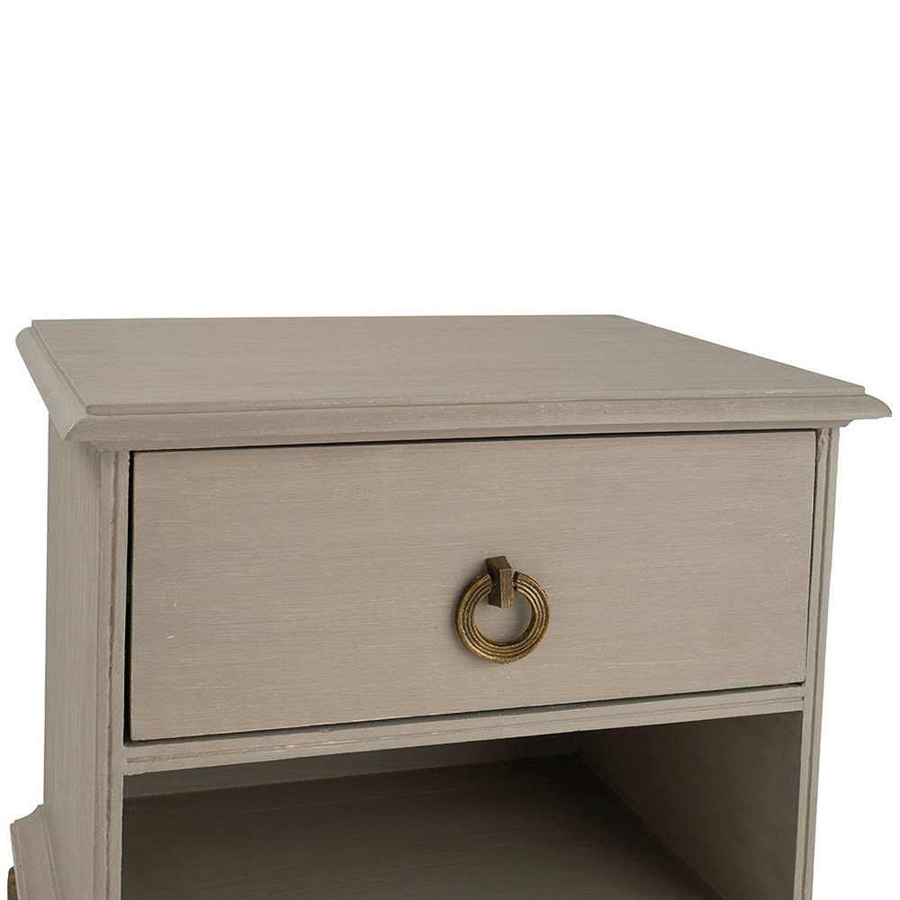 Solid wood bedside table will charm you with its elegant curves and patinated wood. Its brass-finished legs and handles give it a bright and refined touch.